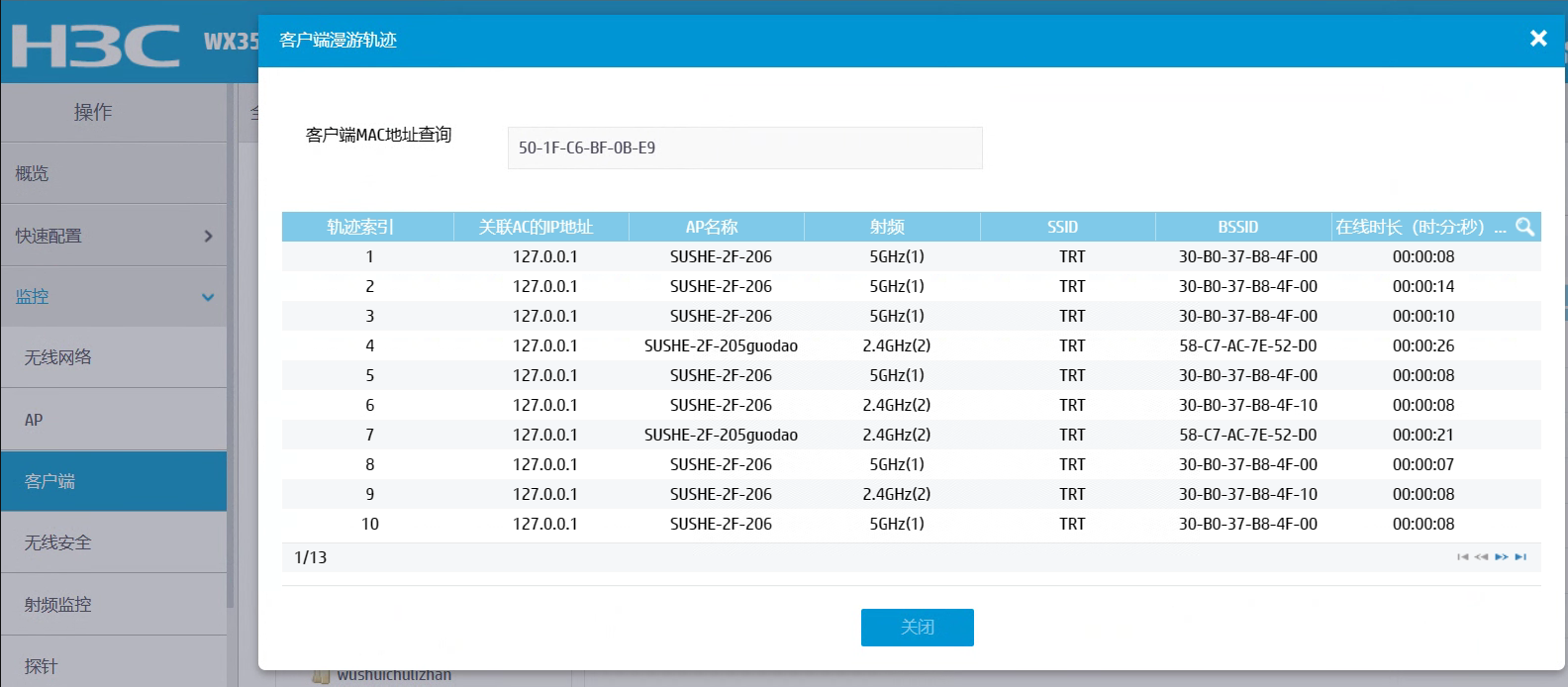 射频是5G和2.4G,没有特殊配置,我查看其他ap下的终端都正常,就206这个终端的在线时长很短,而且在频繁的上下线