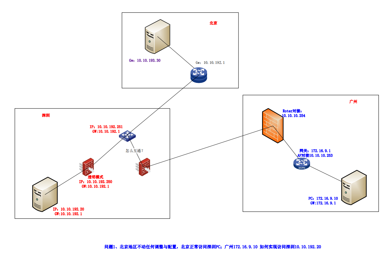 线路是通的,有专线,但是北京深圳的是同一局域网,广州的是另外一个局域网,而且北京那边是没有权限修改,不能动到北京那边的配置。只能修改深圳与广州这把的相关配置。请教下如何写路由?谢谢