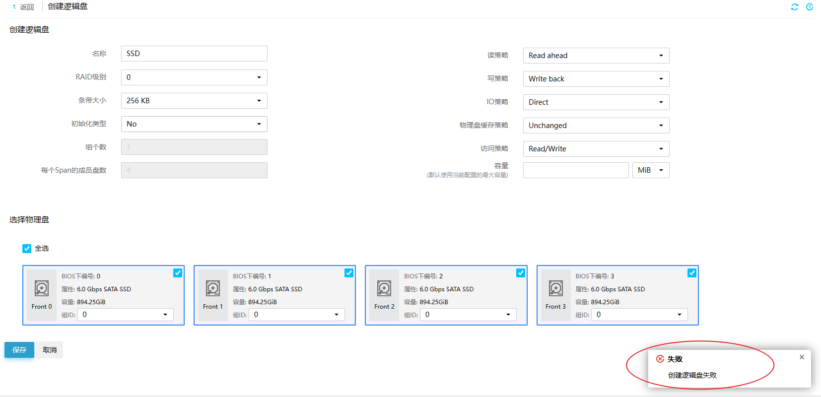 如图,4块SSD,创建raid0,提示失败,原因未知