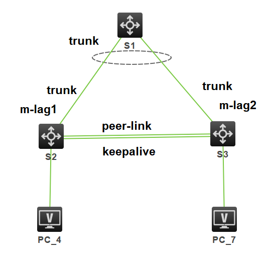 理论上:S2的上联断了,PC4的流量出去会现到达S2,S2到S3,S3再发送给S1,所以peer-link也是需要配置trunk permit vlan all,undo trunk permit vlan 1,这是我的分析,但不确定peer-link链路是否能这样配置,有大神能指点一二吗?
