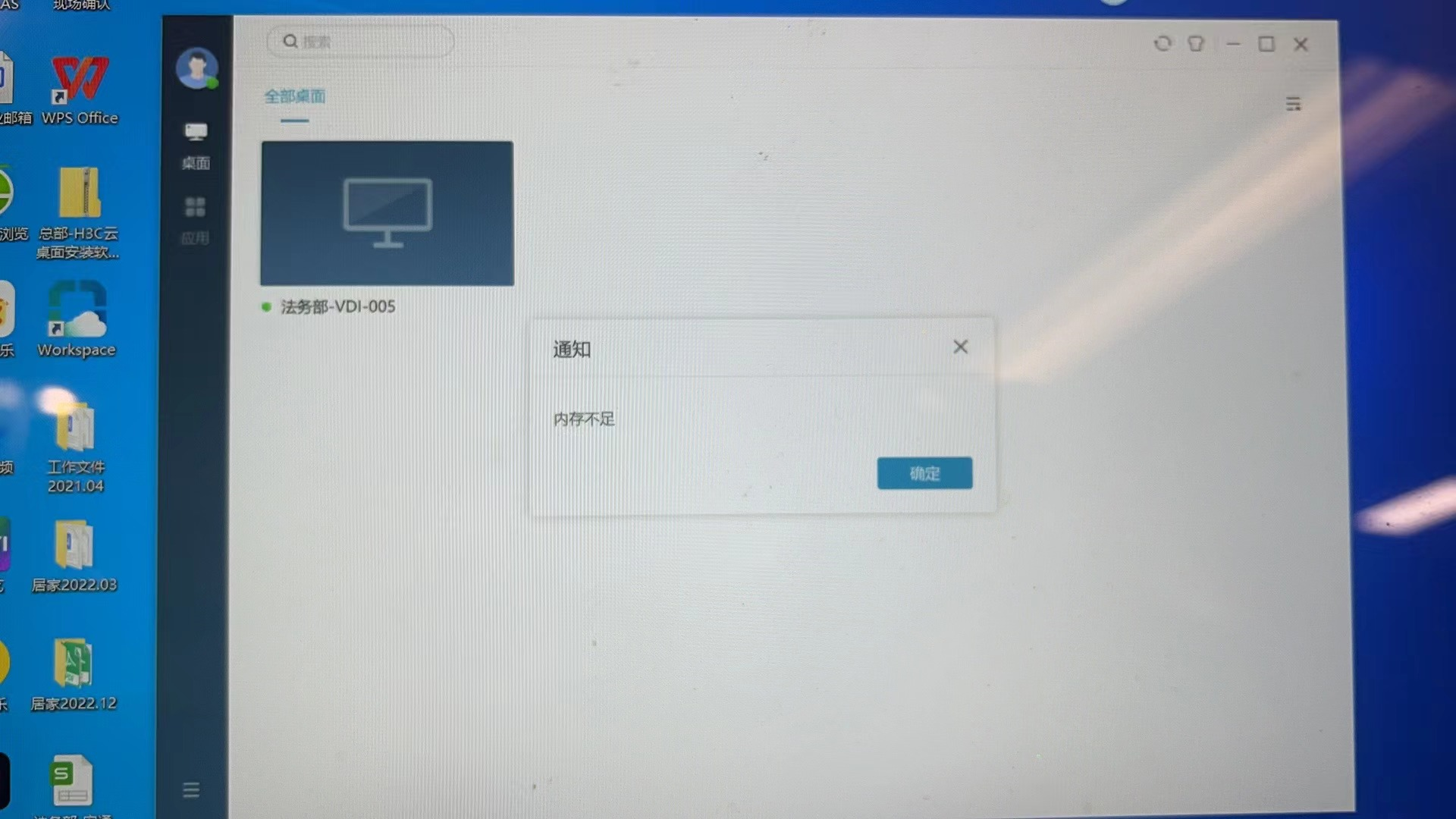 你这是利旧PC上安装workspaceAPP进行连接的吧。 虚拟机和服务器内存正常,大概率是利旧PC内存问题吧,