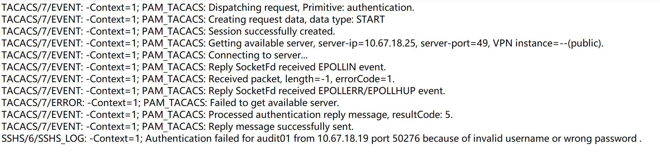 F5020防火墙tacacs认证不成功,请问下这debug日志这是什么原因?