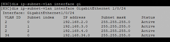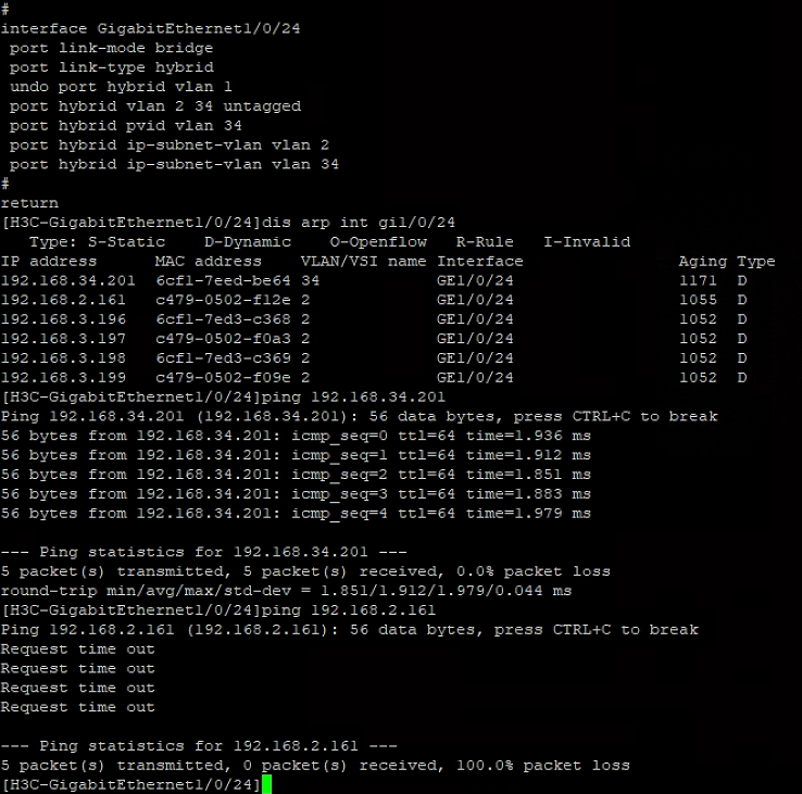 S7006X上配置hybrid端口,多个VLAN只有PVID vlan能通,如果PVID指定为VLAN 2,则VLAN2的IP可以通,如果指定PVID vlan 34,则只有VLAN34的IP能通,置如下: