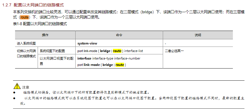 如果是在物理端口下使用port link-mode route切换的时候提示不支持,升级交换机的软件版本到最新看下,升级了还是提示不支持,那就是这款交换机不支持切换到三层路由口。