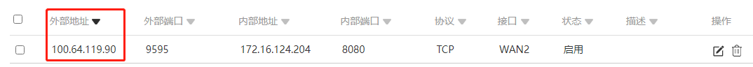 2、设置虚拟服务器(端口映射时),默认的外部地址是路由器显示的地址100.64.119.90,设置无效根本就连不了