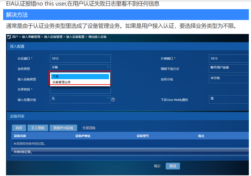 没有该用户。看日志是到了普通接入用户的认证流程中。在改成不限之前是普通用户走到了设备管理用户的认证流程中。