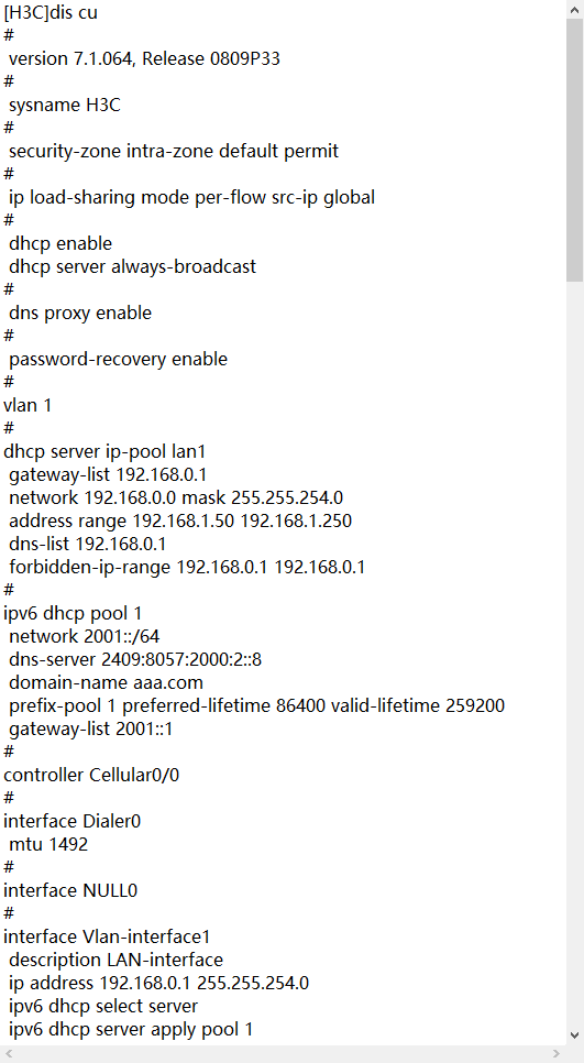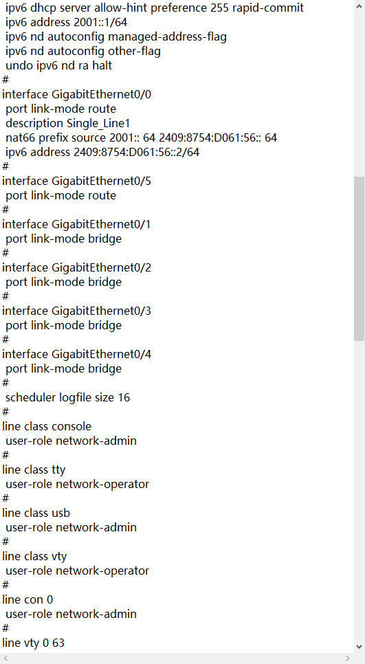 接口G0/0为外网接口,vlan1为内网DHCP,NAT66配置完成后通过display ipv6 session version是有信息出来,但下面PC只能通讯到路由器外口,无法出去