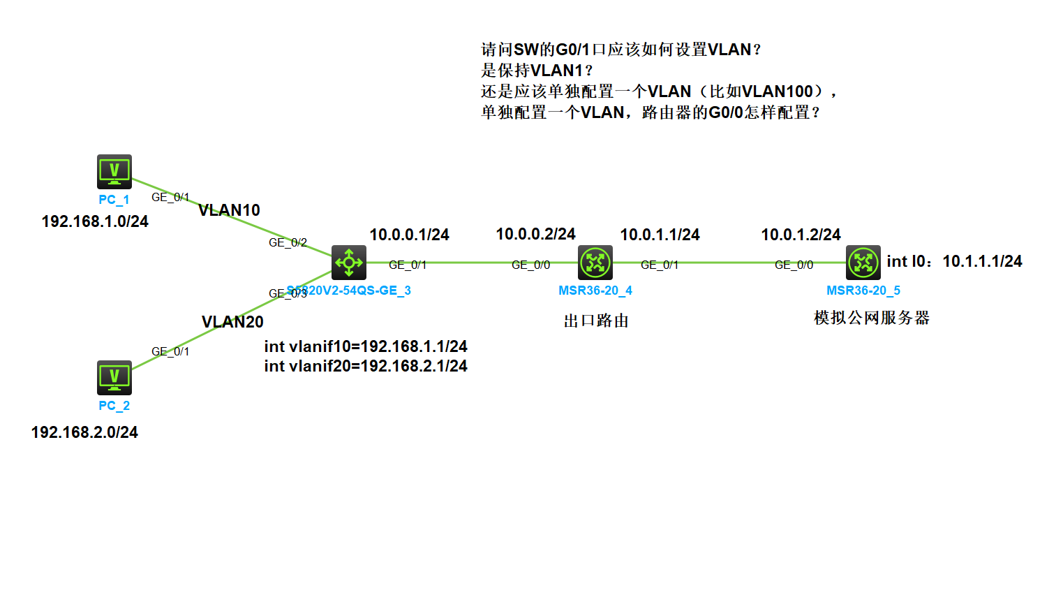 是应该在SW上配置VLANIF1,然后把路由器的G0/0切换成二层,也启用VLANIF1?