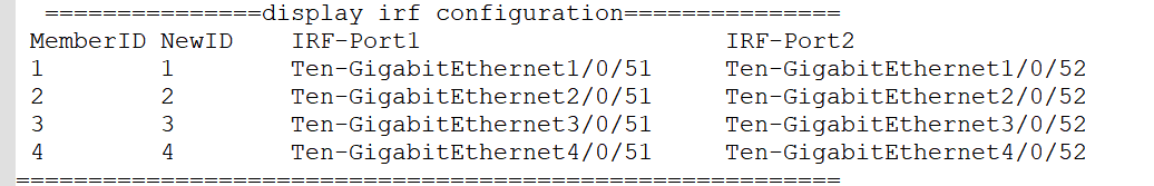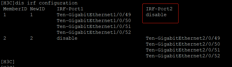 从设备配置上看,每台设备有两个irf port,1和2,与连接的对端需要不同,irf只有两台设备时,只需要一个irf port与对端互联即可,有多台设备进行堆叠时,需要irf port1与一台设备互联,irf port2与另一台设备互联,所以两个都会使用