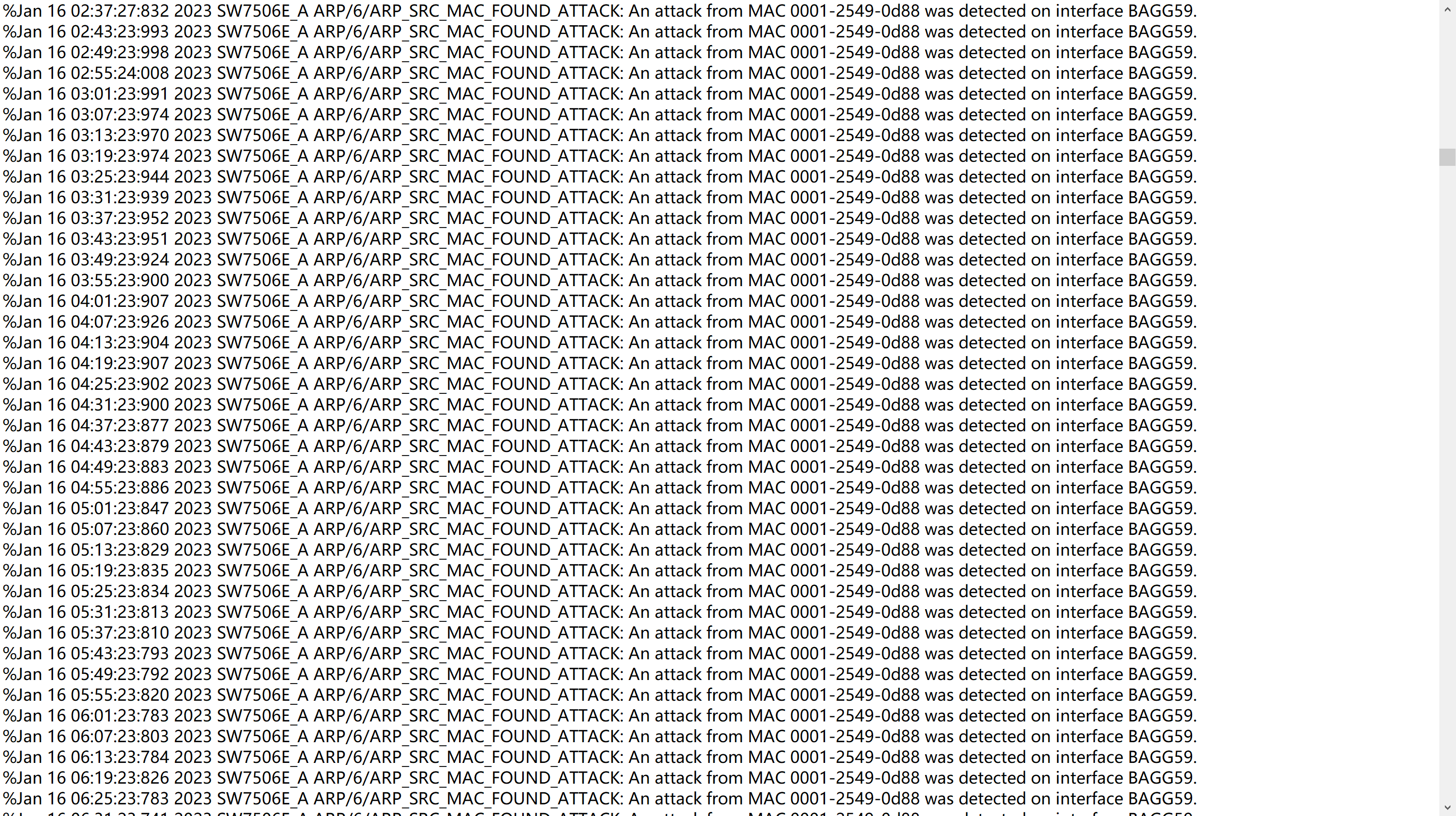 SW7500E-S日志提示:%Jan 14 14:32:26:405 2023 SW7506E_A ARP/6/ARP_SRC_MAC_FOUND_ATTACK: An attack from MAC 0001-2549-0d88 was detected on interface BAGG59.这个接口连的是咱们的网闸,查arp这个mac是网闸的互联口的IP,怎么确认这个是误报还是确实有攻击?