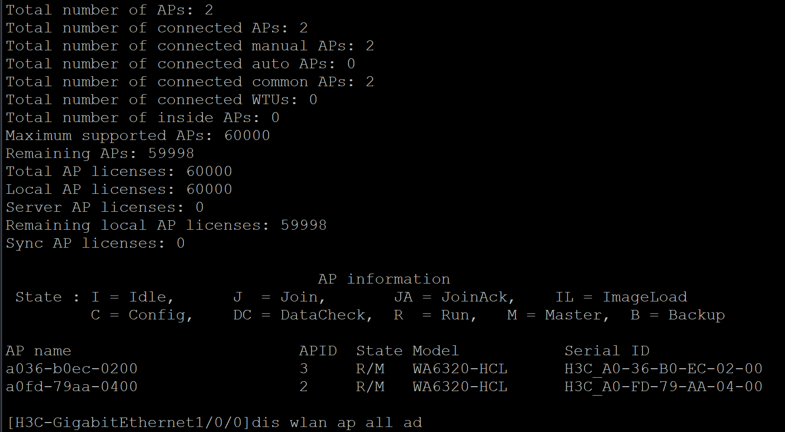 [H3C]dis wlan ap all radio Total number of APs: 2 Total number of connected APs: 1 Total number of connected manual APs: 1 Total number of connected auto APs: 0 Total number of connected common APs: 1 Total number of connected WTUs: 0 Total number of inside APs: 0 Maximum supported APs: 60000 Remaining APs: 59999 Total AP licenses: 60000 Local AP licenses: 60000 Server AP licenses: 0 Remaining local AP licenses: 59999 Sync AP licenses: 0 AP name RID State Channel BW Usage TxPower Clients (MHz) (%) (dBm) a036-b0ec-0200 1 Down 52(auto) 80 0 20 0 a036-b0ec-0200 2 Down 11(auto) 20 0 20 0 a0fd-79aa-0400 1 Down 52(auto) 80 0 20 0 a0fd-79aa-0400 2 Down 6(auto) 20 0 20 0 [H3C]