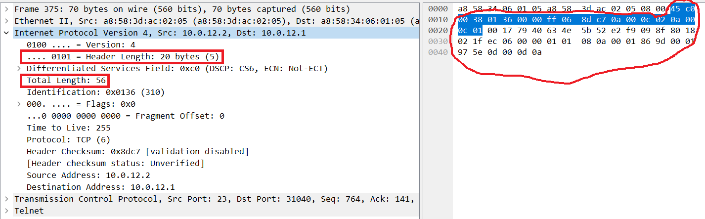 Total Length是指ip头再加上它的载荷的总长(图中右侧红圈部分的总长,即右侧ip头、tcp头、telnet(应用层协议)内容的总长)