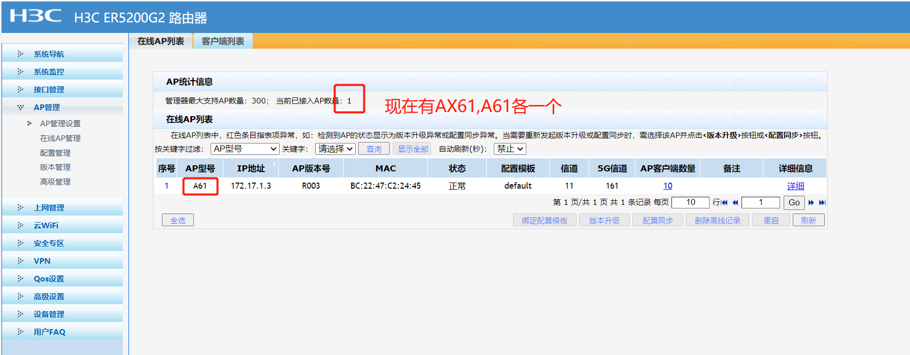 以前购买的H3C ER5200G2路由器无法配置AX61-1500(但A61可以读取到),AX61产品无法在线AP管理,商家回复需要升级路由器软件,找不到相关升级的软件,有知晓的工程师麻烦给个链接下载升级包,谢谢
