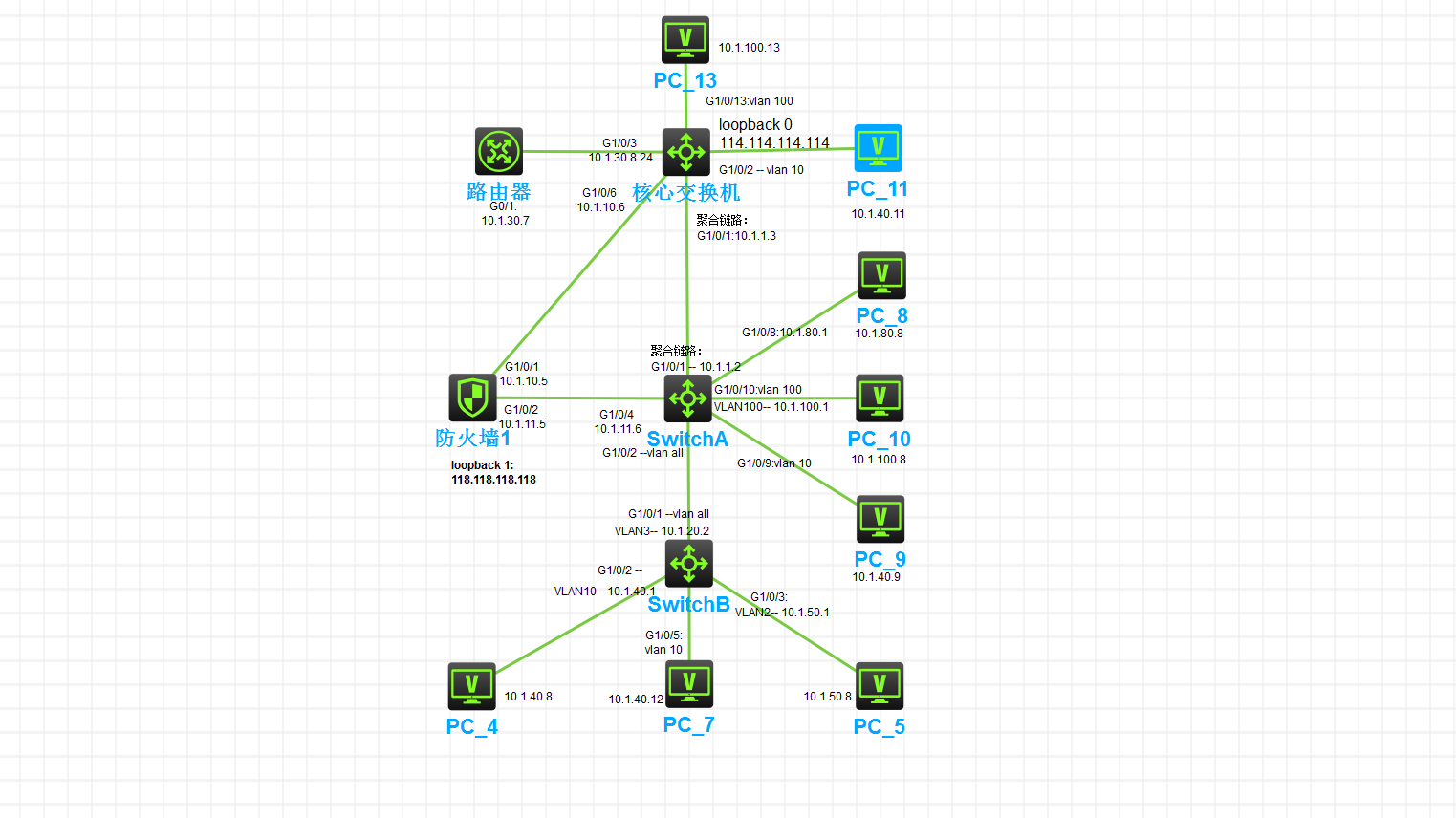 就是PC4不能互访PC11,PC4要走防火墙到核心,PC12不走防火墙到核心。