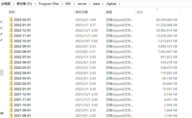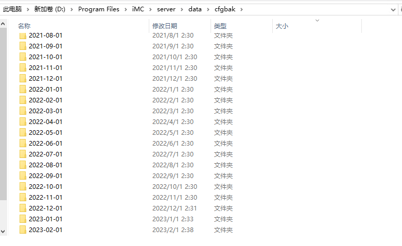 这个不是IMC系统的自动备份目录,从文件日期来看,是每月1号进行一次备份。目录里面备份的是交接机设备的.cfg文件