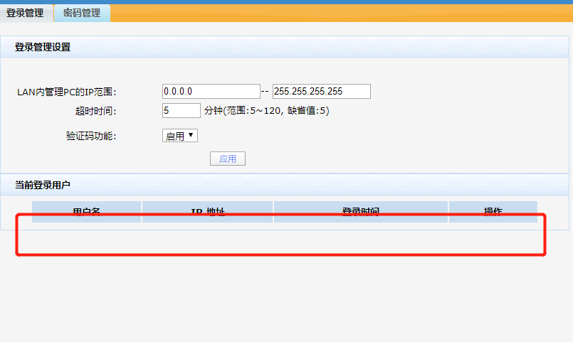 · 设置局域网内允许管理路由器的用户IP地址范围(在“LAN内管理PC的IP范围”文本框中输入允许管理路由器的IP地址范围,单击<应用>按钮生效。此限制功能仅对http/https、telnet访问有效) · 设置Web用户超时时间(在“超时时间”文本框中输入时间参数,单击<应用>按钮生效) · 开启/关闭Web登录页面验证码功能(选择功能状态,单击<应用>按钮生效) · 查看当前已登录的用户信息 · 注销已登录用户(单击某用户所对应的<注销>按钮,即可将该用户强制退出。如需登录,需要重新认证) |