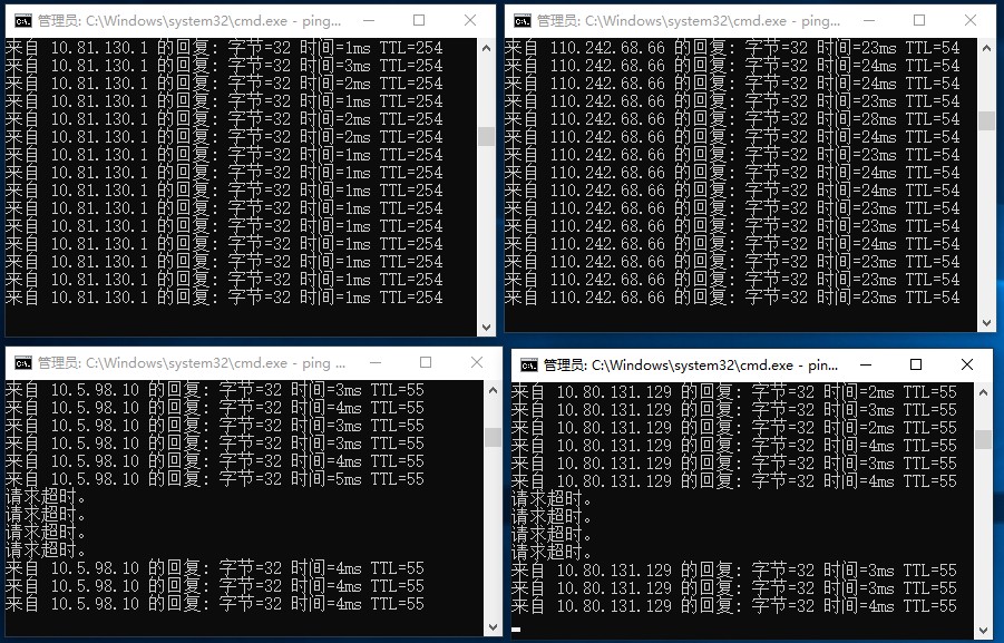 设备是F1000-AK115防火墙,双出口一个是互联网,一个是业务专网,业务专网直连电脑是没问题的,经过防火墙双出口配置后就频繁丢帧,如下图,10.81.130.1是业务专网网关,110.242.68.66是百度,下面两个10.80和10.5是业务专网