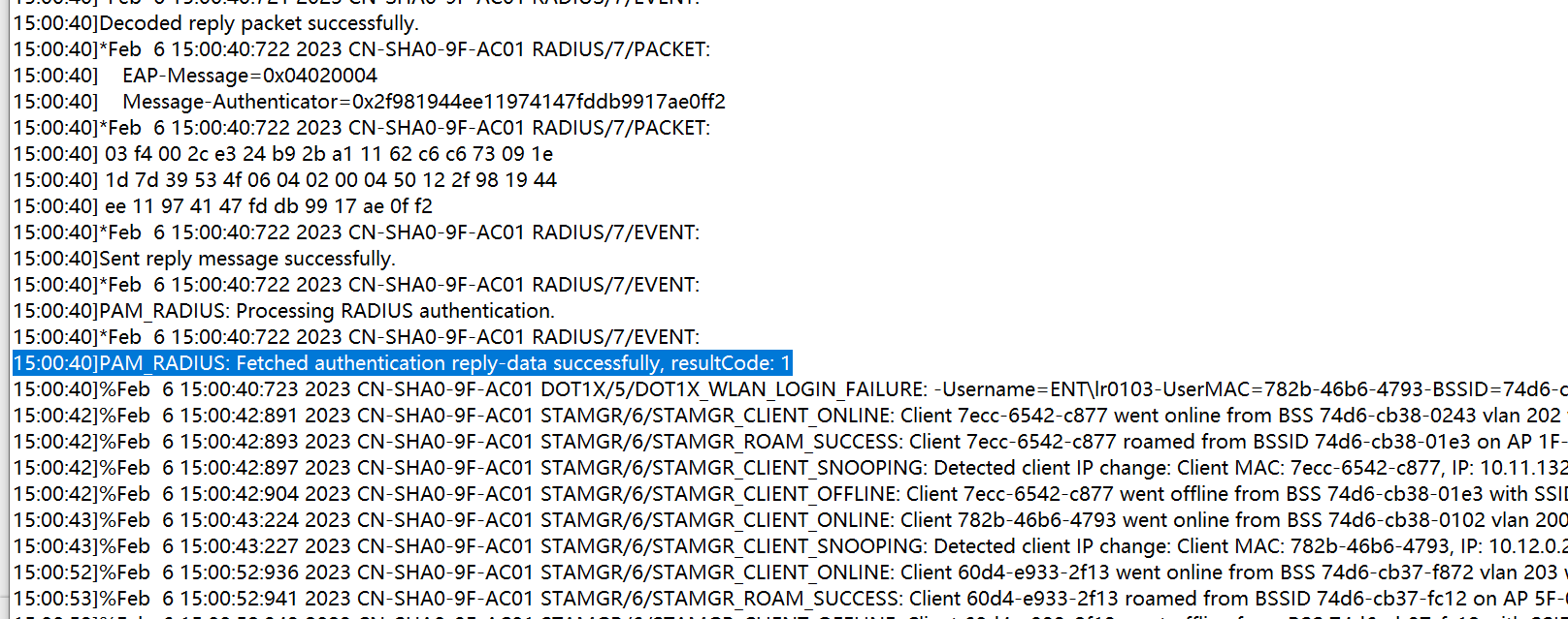 radius三号报文,是服务器回复了AC拒绝认证请求,在服务器上看下认证拒绝的原因。