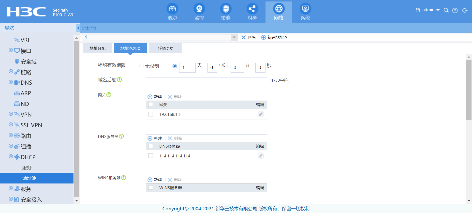 WEB端:改地址池租期时间的配置在哪里?