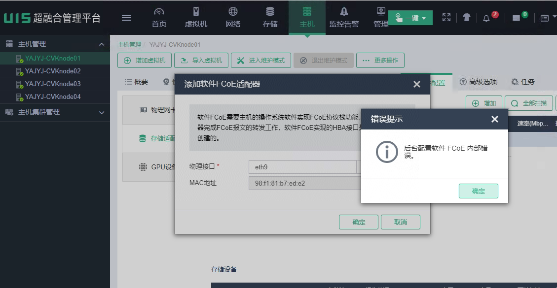为CVK 添加FCoE存储适配器报错“后台配置软件 FCoE内部错误”