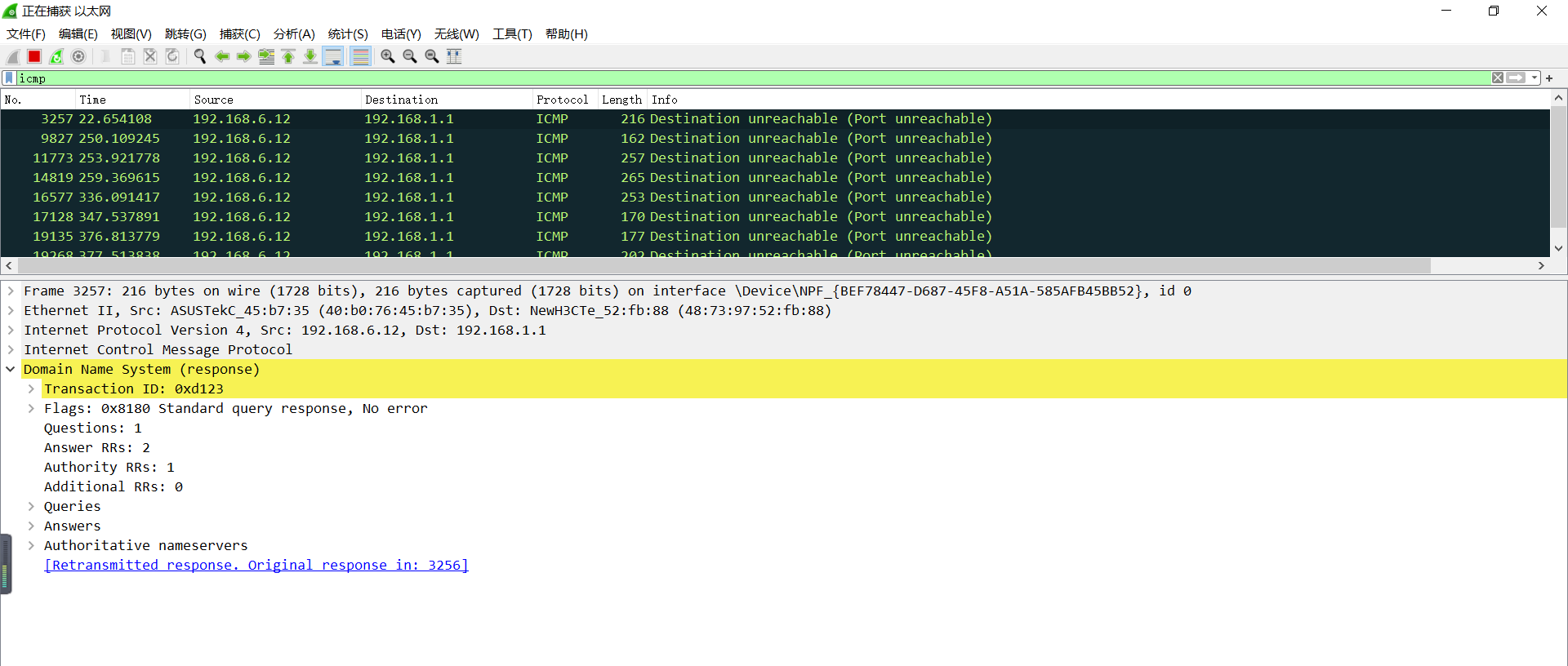 就只能抓取到少量的192.168.1.1的ICMP目的端口不可达报文了