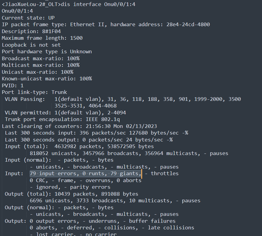 同一台OLT上 95%以上接口都出现 错误帧 和巨型帧, 清理过计数器后依然曾在并累加