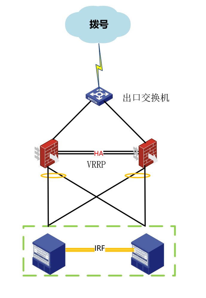 双机想要用拨号的话的,只能用IRF,冗余口或者聚合口(聚合口有的版本会有问题,如果要用聚合口可以咨询400一下版本问题)