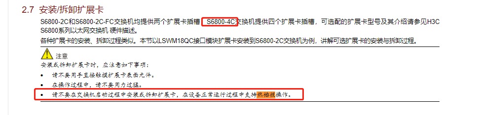 · 请不要在交换机启动过程中安装或拆卸扩展卡,在设备正常运行过程中支持热插拔操作。