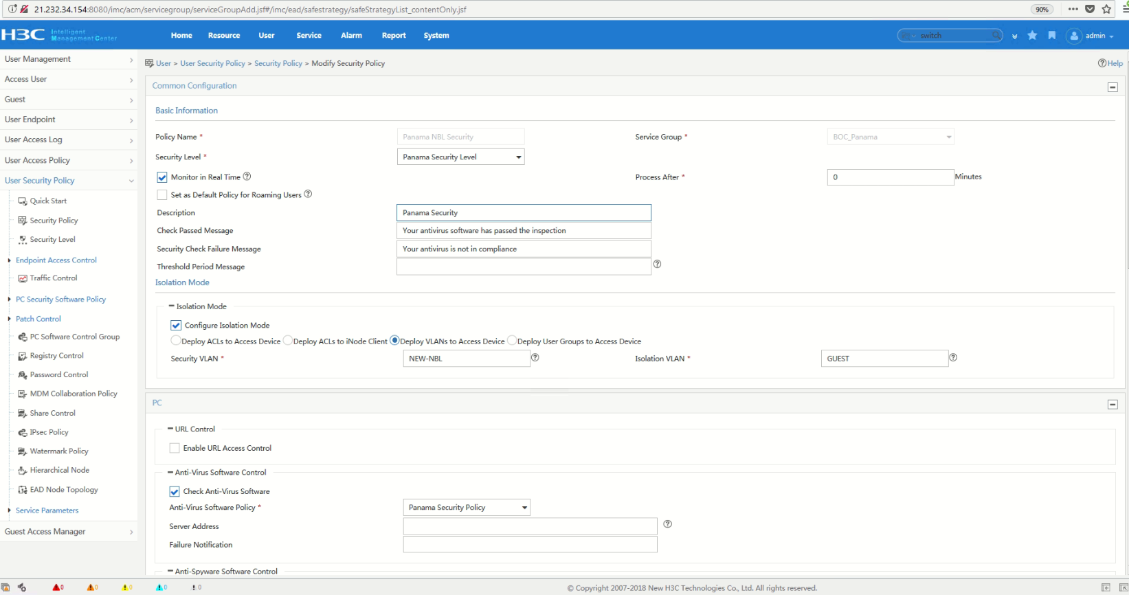 IMC配置的接入服务中关联安全策略后下发VLAN错误,属于NBL网段的终端都下发的OA的vlan,配置截图如下: