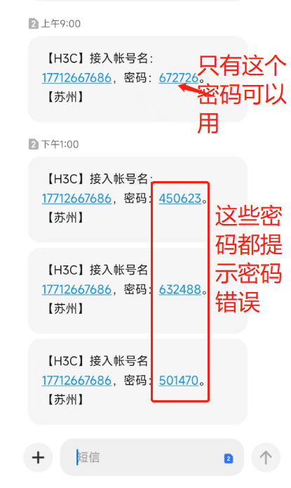 iMC-EIA短信开户,只有第一个短信的密码可以用,后面再次用同一个手机再次获取密码,密码是动态随机的,但是认证时提示密码错误,只有使用第一个短信密码可以认证成功,错误码提示E63032,这是什么原因啊。。。。急!