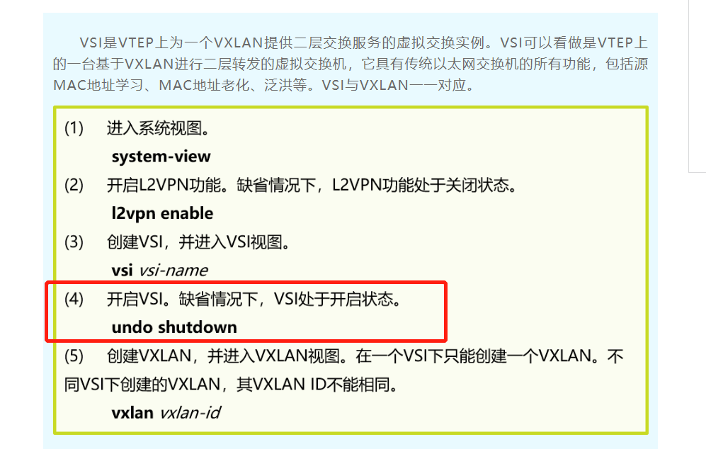 在图片的步骤照敲,到了vxlan 100的那就敲不上,?号视图下敲不了。不是说缺省开启VSI,我undo shutdown了,是在vsi+名字的视图里敲的,之后还是敲不上vxlan 100