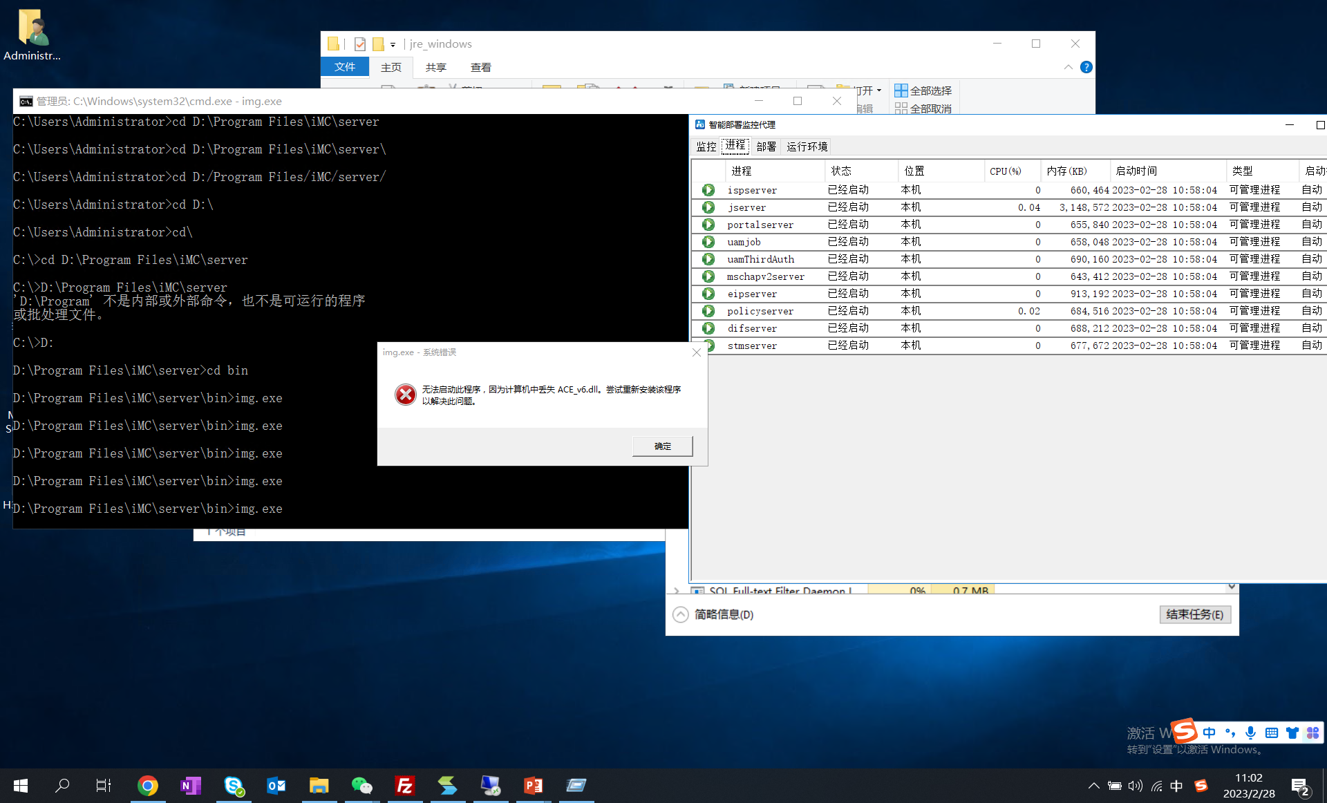 现场环境是否装过杀毒软件?可能把dll文件误删了。关闭/卸载杀毒软件后,可以尝试从现场imc 平台版本基础版本安装包中,比如0703版本安装包,H3C_iMC_PLAT_7.3_E0703_Standard_windows.zip\windows\install\components\common\server\commonserver_win.zip\server\bin下,找到 ace_v6.dll放在 iMC/server/bin路径下,之后重启imc服务器,再启动进程看看