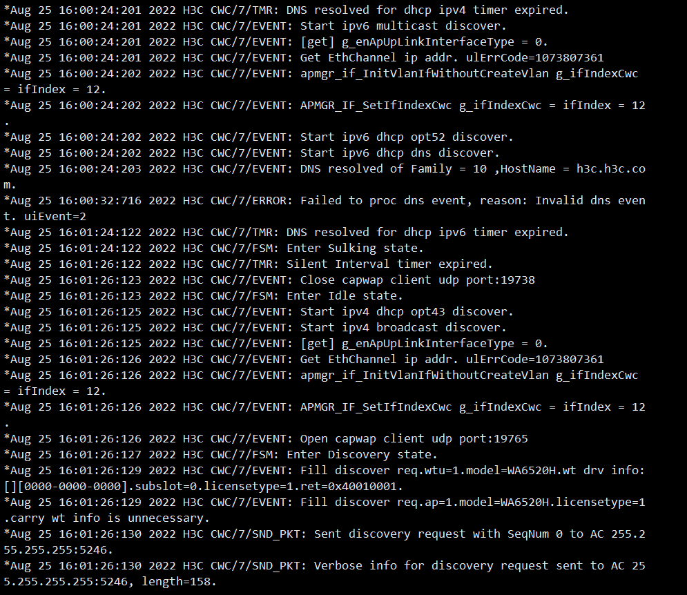 一台6520H能拿到地址,也能拼通AC 10.25.255.253,AC授权也够,就一直上不了线,在AP中debug wlan capwap如下: