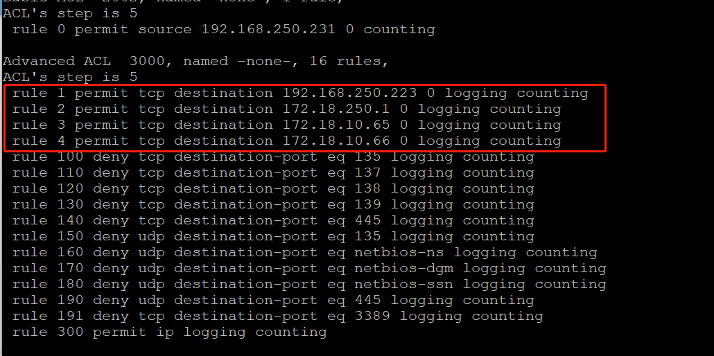 交换机处于核心角色,终端网关在该交换机上,配置了一条ACL 3000的访问控制规则列表阻断高危端口访问,其中有一条阻断3389端口的规则rule编号是191,配置了一条编号4,动作是允许的策略却无法使用,测试时还是阻断状态,将191删除后即可正常访问。请问各位大佬们这是什么情况呢?