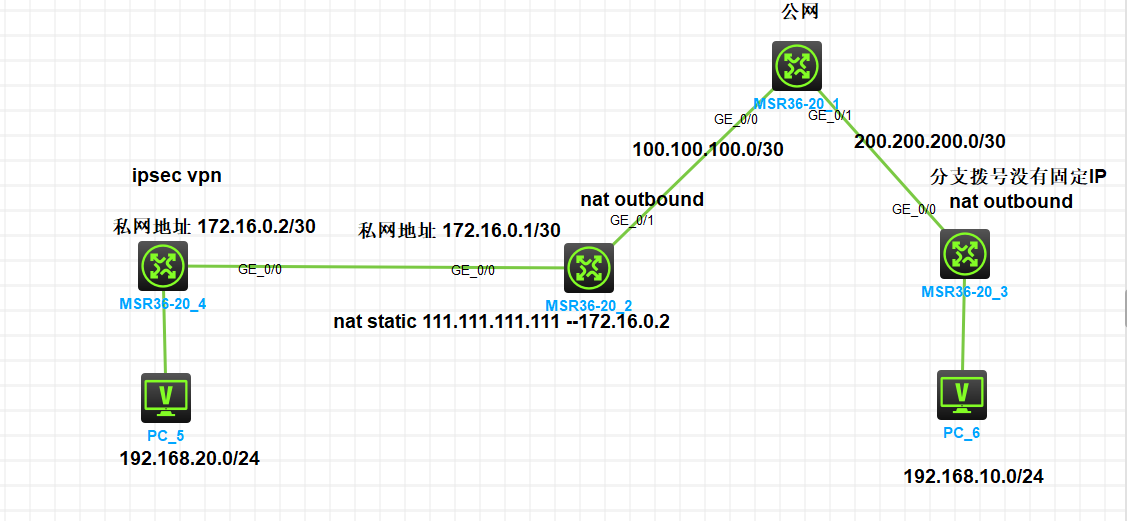 拓扑如下,客户要求测试IPSec ,总部 网关是一台路由 ;路由后是一个防火墙(图中用msr-3620_4替代) ,用来做IPSec vpn ,总部公网地址已经用来搭建其他IPSec 了、目前,用的是运营商分配的用户ip 111.111.111.111(举例) 静态映射 172.16.0.2 给vpn (图中的msr3620_4) 、分支无固定IP、在模拟器上实验、ike sa 能起来,IPSec sa 无、谁有相应的配置案例? 这个感兴趣流如何写 ,这个有nat 穿越 ,不知道问题在哪里?总部是 IPSec policy-temp模板 加 野蛮模式 ;分支接口下 已经排除感兴趣流的nat 了 。111.111.111.111 全网路由可达;分支路由能ping 通;
