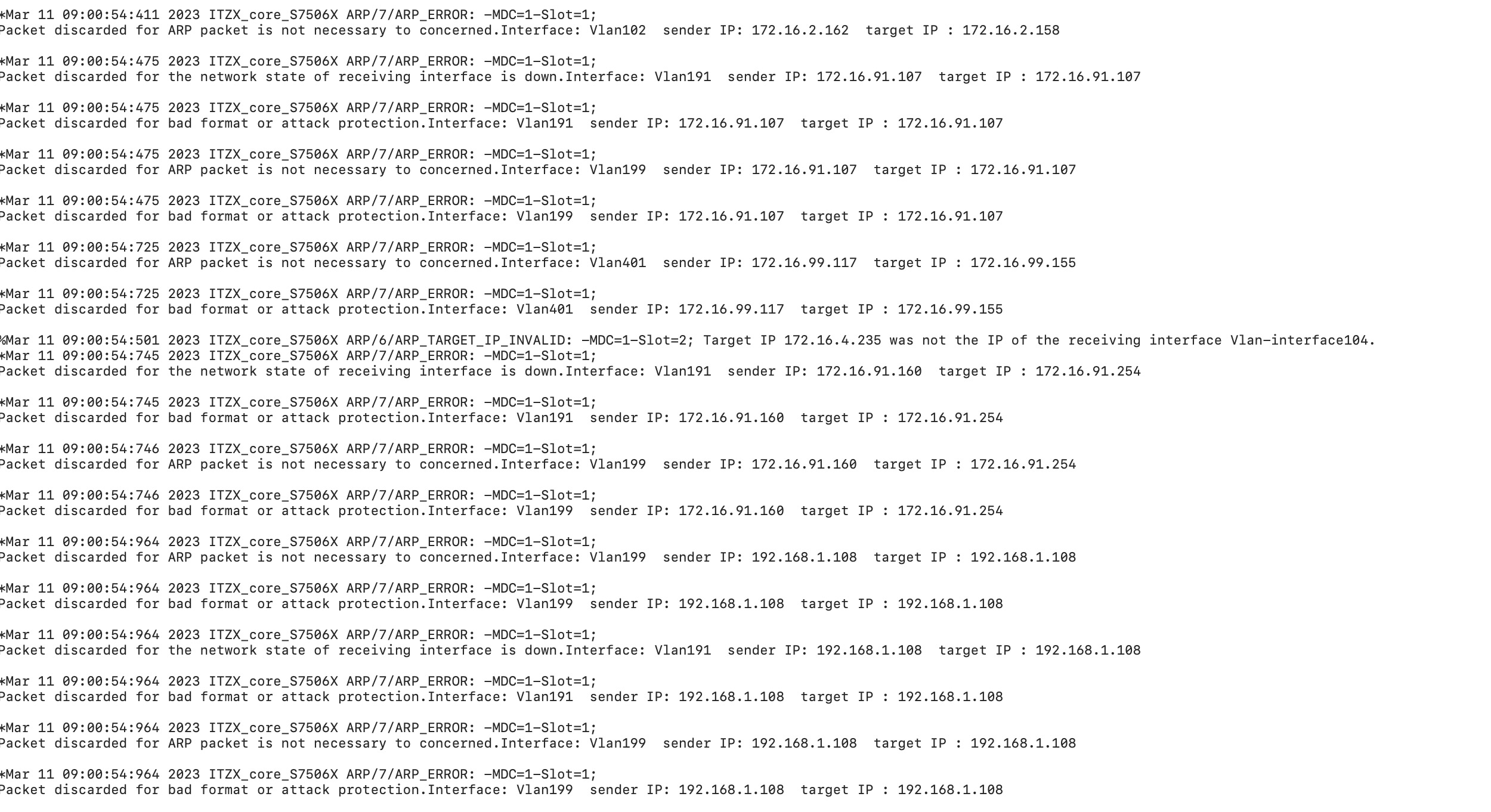 vlan 199是什么网段的,看日志像是内网发的arp的包格式不对,导致丢弃
