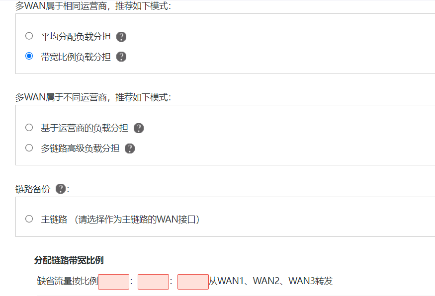 三wan口线路,同一运营商,已设置带宽比例负载分担,还有一个分配链路带宽比例-缺省流量按比例::从WAN1、WAN2、WAN3转发;此比例分配不知道怎样设置,wan1-100M,wan2-1000m,wan3-20m