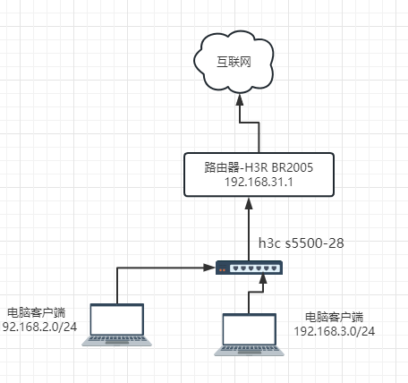 客户端有两个网段,通过DHCP从交换机S5500获取IP,S5500上联BR2005路由器,通过路由器访问外网。
