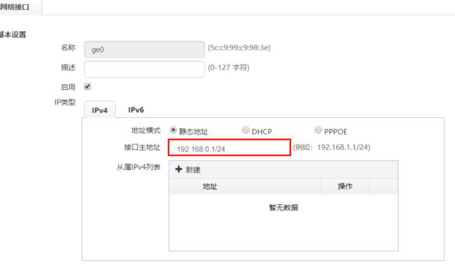 #选择“网络配置”>“接口配置”,点击ge0接口的编辑按钮。