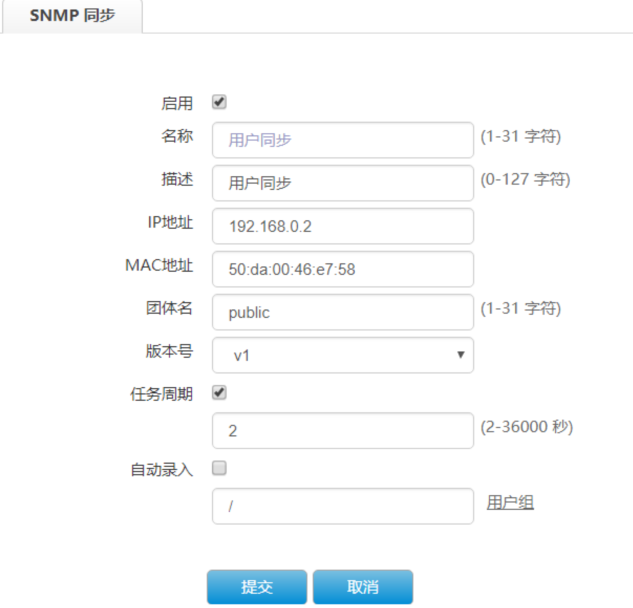 #勾选启用SNMP同步选项,名称及描述可以自定义、IP地址及MAC地址是与ACG1000互联交换机的接口地址192.168.0.2、MAC地址为50da-0046-e758、