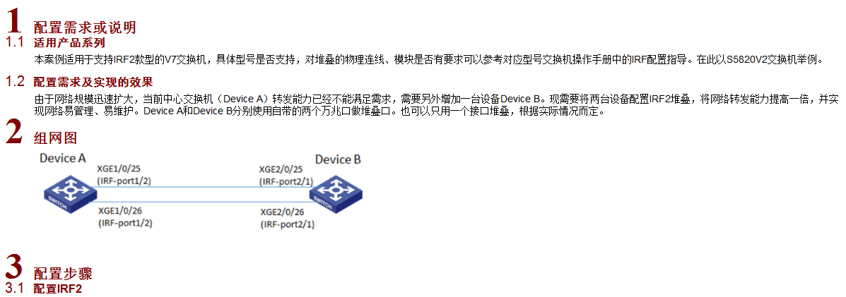 1)IRF-port端口编号说明,irf-port 1/2中,第一个数字代表的是设备成员编号,第二个数字是接口编号。堆叠要求使用逻辑端口1对接逻辑端口2。即,如若第一台配置irf-port1/2,则第二台需要是用irf-port2/1对接。如若第一台使用irf-port1/1,则第二台需要配置irf-port2/2。