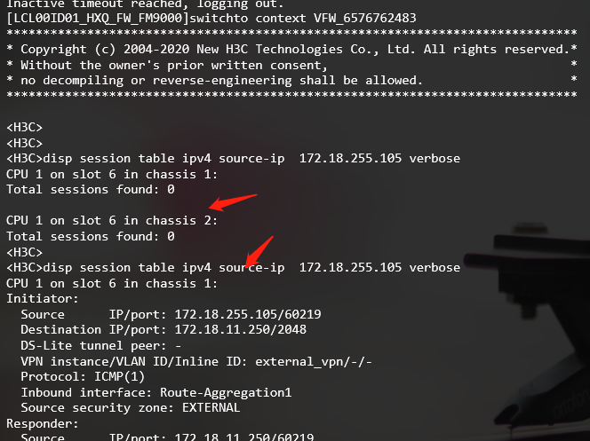 1、从交换机ping服务器IP,可ping通,中间经过M9000的一个虚墙,ping前虚墙无会话,Ping通后有会话,证实流量经过该虚墙;