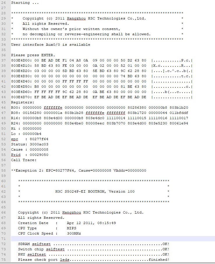 H3C S5024P-EI BOOTROM, Version 100交换机在正常使用过程中突然多次自动重启,异常信息如下
