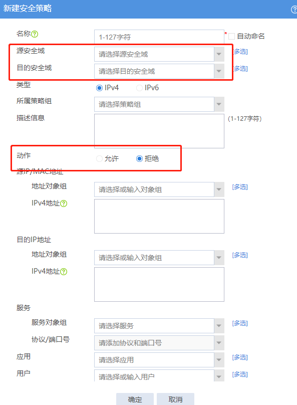 安全策略 目的安全域选择相应的外网接口安全域 动作拒绝