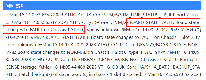 %Mar 16 14:03:33:358 2023 YTHG-CQ-JK-Core STM/6/STM_LINK_STATUS_UP: IRF port 2 is up. %Mar 16 14:03:56:647 2023 YTHG-CQ-JK-Core DEVM/2/BOARD_STATE_FAULT: Board state changes to FAULT on Chassis 1 Slot 0, type is unknown. %Mar 16 14:03:59:047 2023 YTHG-CQ-JK-Core DEVM/2/BOARD_STATE_FAULT: Board state changes to FAULT on Chassis 1 Slot 2, type is unknown. %Mar 16 14:05:35:325 2023 YTHG-CQ-JK-Core DEVM/5/BOARD_STATE_NORMAL: Board state changes to NORMAL on Chassis 1 Slot 0, type is LSQ1SRPA. %Mar 16 14:05:35:583 2023 YTHG-CQ-JK-Core LICENSE/4/LICENSE_WARNING: -Chassis=1-Slot=0; Format LICENSE storage! %Mar 16 14:05:44:488 2023 YTHG-CQ-JK-Core HA/5/HA_BATCHBACKUP_STARTED: Batch backup(s) of slave board(s) in chassis 1 slot 0 started. %Mar 16 14:05:57:052 2023 YTHG-CQ-JK-Core HA/5/HA_BATCHBACKUP_FINISHED: Batch backup of slave board in chassis 1 slot 0 is finished. %Mar 16 14:06:01:942 2023 YTHG-CQ-JK-Core DRVDBG/2/LOG Info: -Chassis=1-Slot=0; Board is loading file on Chassis 1 Slot 3. %Mar 16 14:06:03:169 2023 YTHG-CQ-JK-Core SHELL/5/SHELL_LOGINFAIL: AUX user failed to log in on AUX0. %Mar 16 14:06:08:555 2023 YTHG-CQ-JK-Core SHELL/5/SHELL_LOGINFAIL: AUX user failed to log in on AUX0. %Mar 16 14:06:09:612 2023 YTHG-CQ-JK-Core DRVDBG/2/LOG Info: -Chassis=1-Slot=0; Board has finished loading file on Chassis 1 Slot 3. %Mar 16 14:06:17:831 2023 YTHG-CQ-JK
