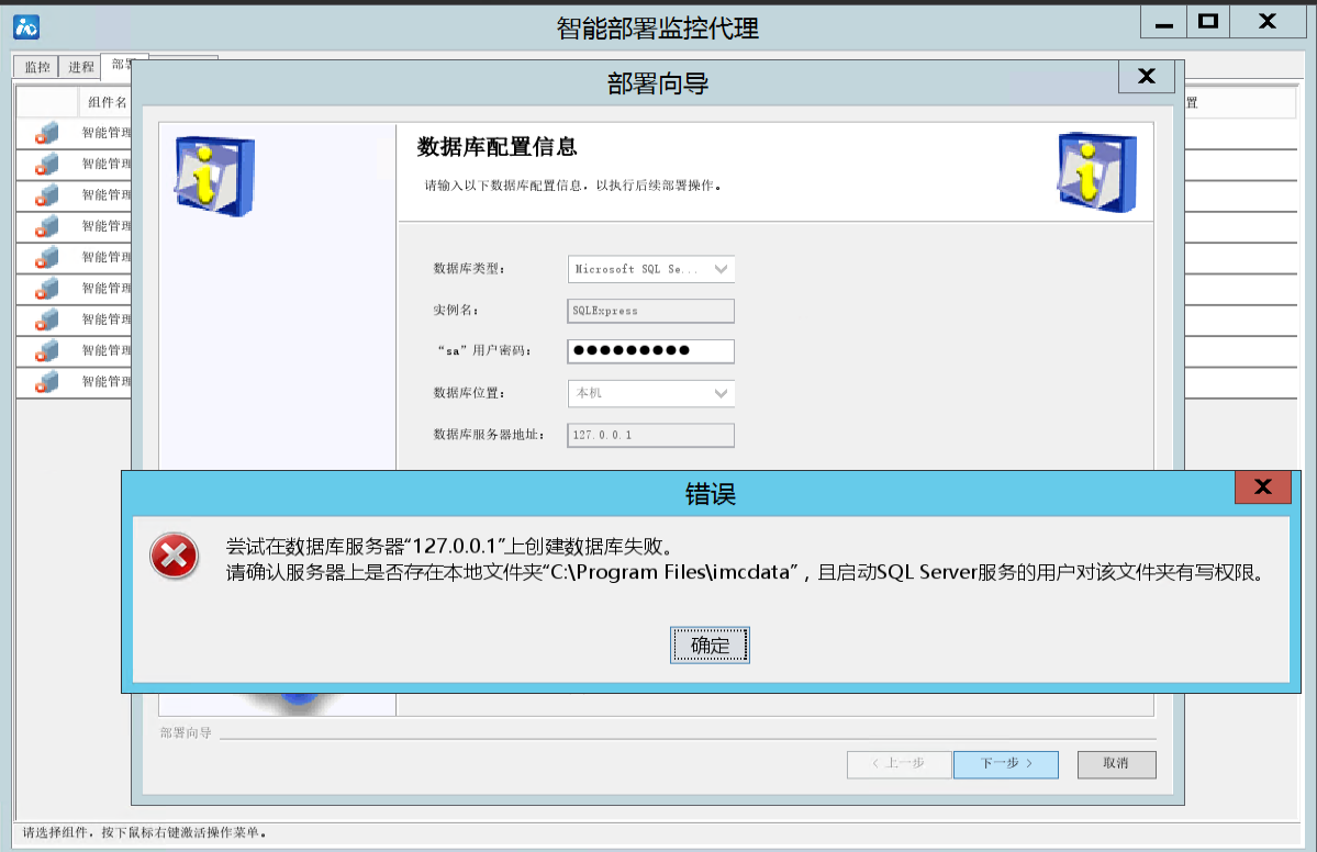 iMC在安装过程中需要连接数据库并在设置的数据文件存放目录下(默认是imcdata\)创建数据库文件,如果数据库没有在此目录下创建文件的权限就会报此错误。此错误的根本原因就是数据库没有对数据存放文件夹的操作权限导致。
