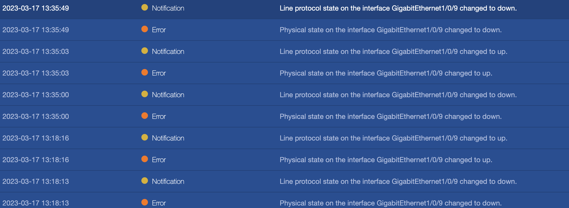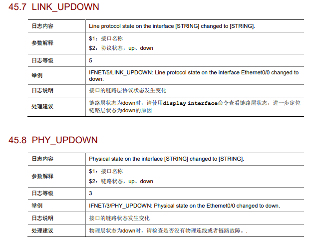 Mar 17 16:15:19 2023 H3C %%10IFNET/3/PHY_UPDOWN: Physical state on the interface GigabitEthernet1/0/2 changed to down.