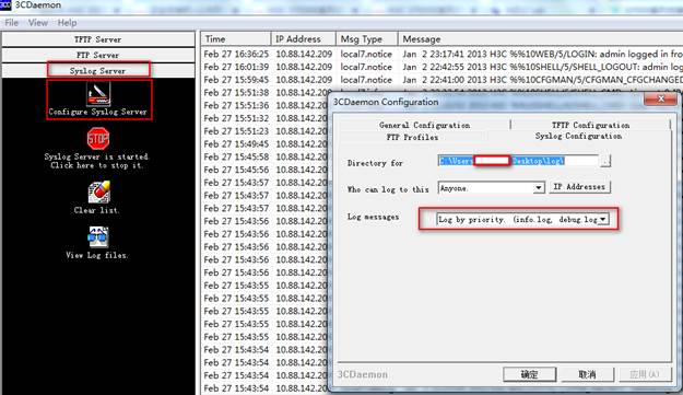 #在日志主机上安装并配置syslog server,这里应用3CDaemon软件为例,操作界面如下图所示,log messages可以根据priority、facility以及ip address将信息记录到不同的文档。