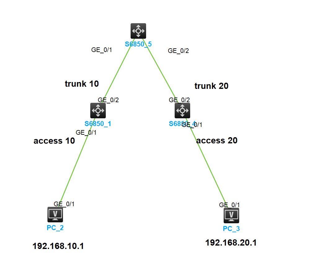 PC2访问PC3,网关都都在SW5上,SW1收到PC2的数据包打上vlan10的标签,SW1发往SW5pvid还是10,但是SW5往SW4发,放通的是TRUNK 20 为什么还能放出去呢,pvid是10