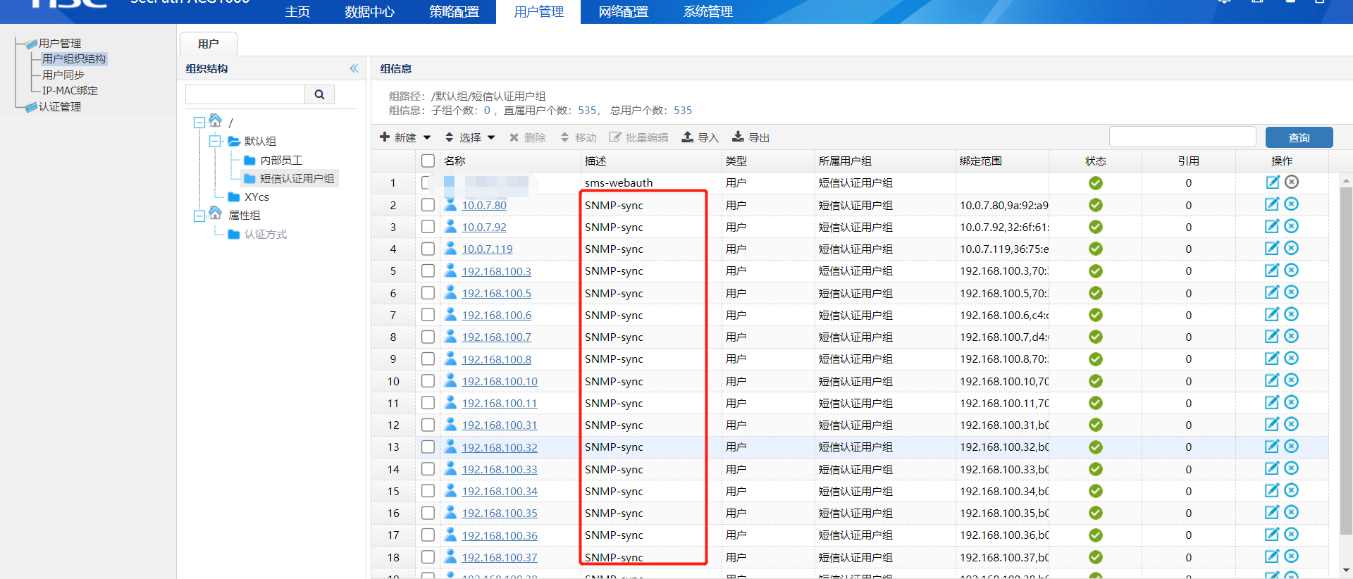组网方式 防火墙-ACG-AC-POE交换机-AP 之前正常使用、最近用户连接后无法弹出短信认证界面、直接连接上网、ACG平台显示用户认证方式静态绑定、用户组织架构描述SNMP-sync。请问大神们这个是什么问题要怎么解决